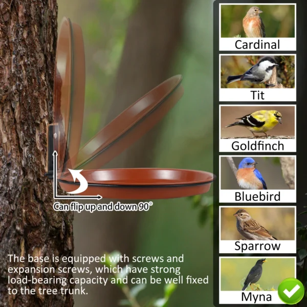 This bird feeder base with screws and expansion screws has a strong weight capacity and can be well fixed on the tree trunk, sturdy and durable. In addition, the tray iron frame can be flipped up and down 90 degrees, so it can be folded against the tree trunk when not in use.